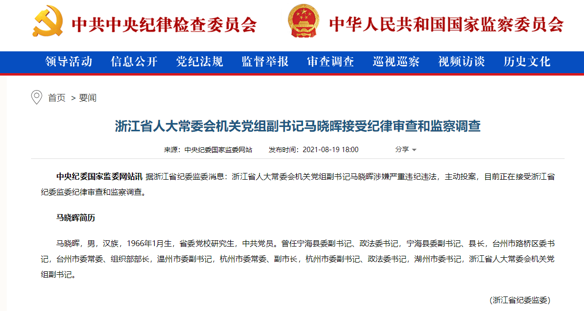 此次被查,也是官方首次披露,他已調任浙江省人大常委會機關黨組副書記。
