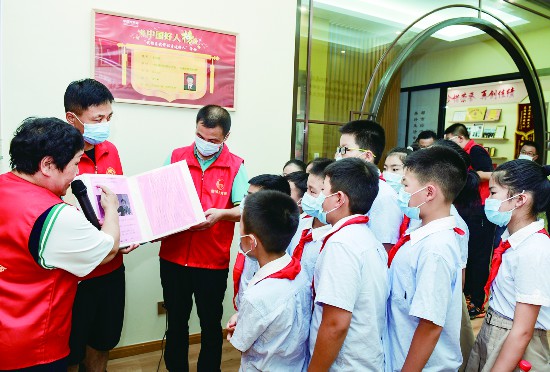 8月21日,金華市環城小學部分少先隊員來到婺城區社會矛盾糾紛調處化解中心城區分中心,進行暑期研學,尋訪身邊的黨員先鋒。 省優秀共產黨員、民情民訪代辦員宋園春以及志愿者倪軍健、朱海鋒,向隊員們介紹工作情況。隊員們立志傳承先鋒精神,爭做新時代好少年。(李建林)