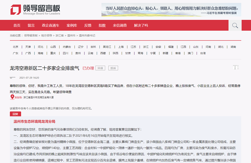 溫州市龍灣區空港新區德信觀瀾苑小區業主一直有件煩心事:小區距離精鑄小微園只有一街之隔,時常能夠聞到工業園區里閥門鑄造企業排放廢氣的刺鼻氣味。業主們都很擔心,長此以往,工業園區排放的廢氣不僅會對空氣產生污染,也將影響小區業主的身體健康。
