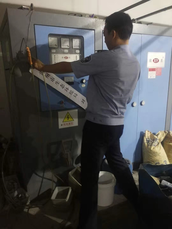 執法人員對小微園區內違規企業的設備進行查封。溫州市生態環境局龍灣分局供圖