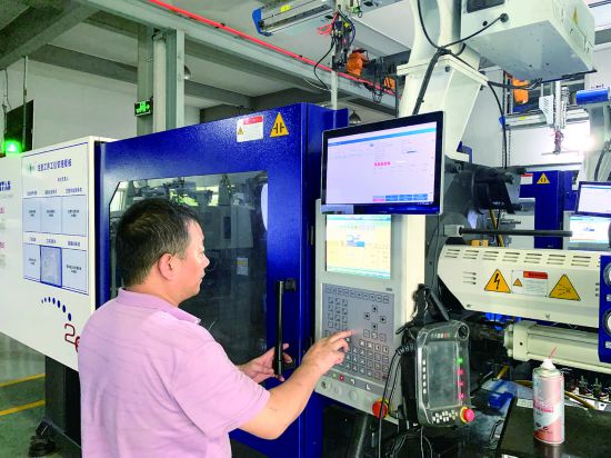 臨海市永恒汽配科技公司車間里,數十臺注塑機一字排開,投料、生產,機械臂有序滑動,偌大的車間里,偶有工人游走在機器間,機器一側的三聯屏顯示器上,各項生產指標不斷滾動。