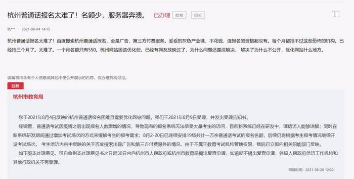 近日,有網友在人民網“領導留言板”上反映“杭州普通話報名太難了”。該網友表示杭州普通話報名名額少,服務器奔潰。收到留言后,杭州市教育局高度重視,立即進行整改,通過研發新的考試報名系統、增加考試場次等方式解決了考生報名需求,并通過“領導留言板”進行了詳細說明。【留言原文鏈接】