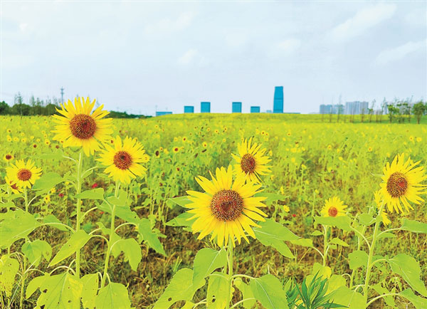 近日,在杭州錢塘區義蓬街道地鐵7號線塘新線地鐵站附近,成片的向日葵舒展身姿,相繼盛開,吸引眾多游人前來賞花游玩。(法鑫)