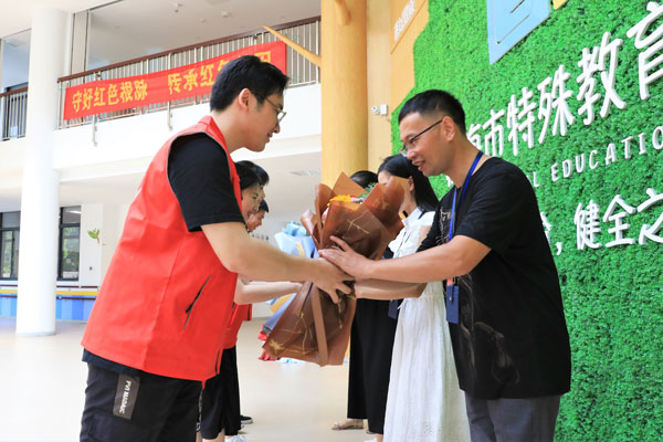 “星空”志愿服務隊員向特教中心老師獻花。俞文君攝
