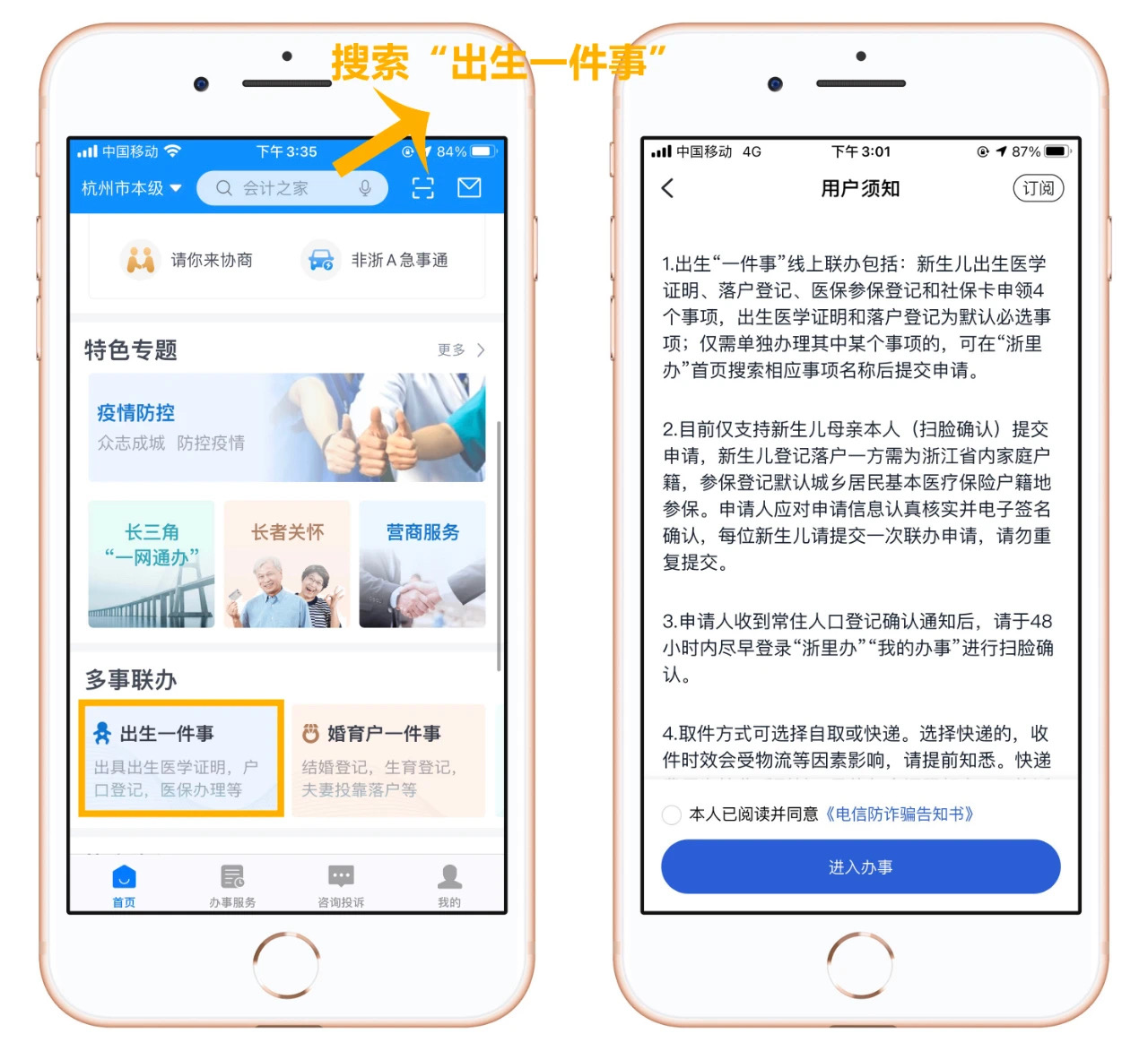 2019年5月,臺州市行政服務中心正式啟動出生“一件事”集成辦理,實現市、縣兩級行政服務大廳與助產機構同步提供出生“一件事”集成辦理服務,為浙江首創。出生“一件事”集成辦理圍繞出生醫學證明、預防接種證、戶口登記、城鄉居民基本醫療保險登記、生育待遇核準支付、社會保障卡·市民卡等新生兒出生后需要辦理的事項,按“一件事”進行梳理,推動跨部門聯辦。