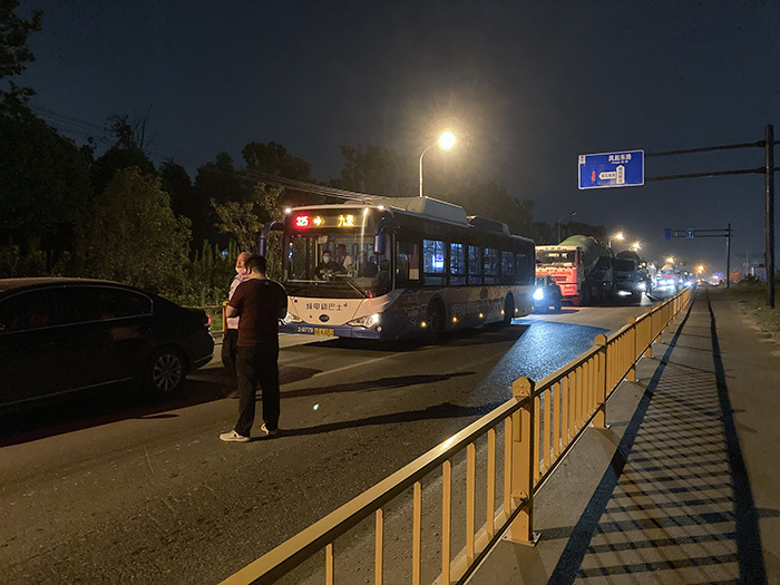 昨晚19時左右,記者趕到事發地,發現傾倒的支撐柱還在路面,長度約10米,而被砸損的公交車和貨車已經不見。天色已黑,現場正在開展搶險救援工作,事發地東西兩側約3公里路段禁止通行。