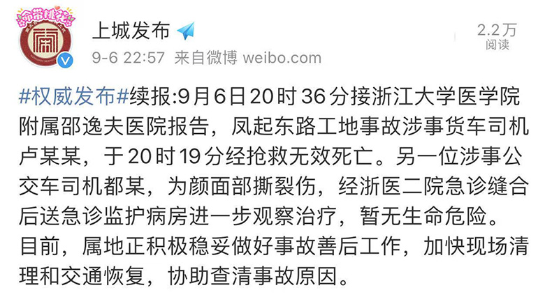 昨晚20時36分,記者從浙江大學醫學院附屬邵逸夫醫院獲悉,涉事貨車司機盧某某于20時19分經搶救無效死亡。另一位涉事公交車司機都某,為顏面部撕裂傷,暫無生命危險。
