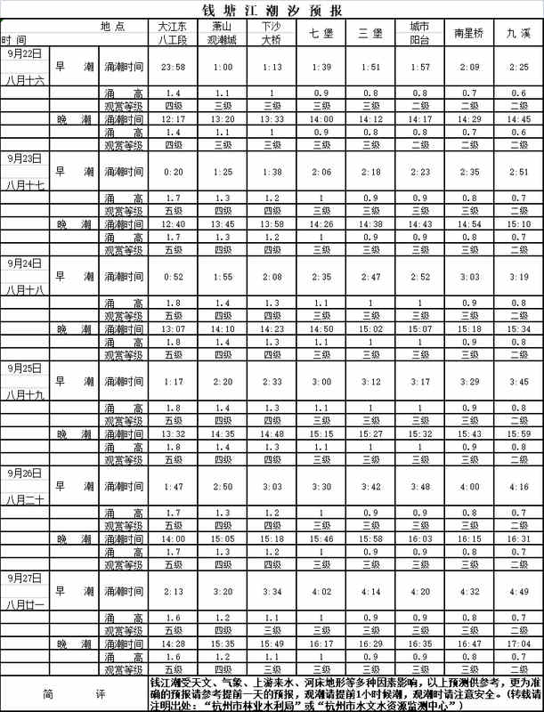 從上圖所示的涌高來看,今年大潮的最佳觀賞時間是農歷八月十八、十九,即陽歷9月24日、25日這兩天。不過,大潮的觀賞效果究竟如何,還是要看天公是否做美。