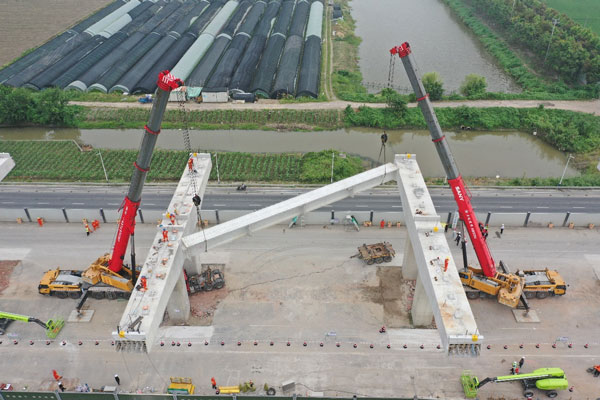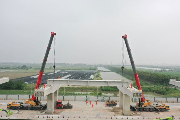 杭紹甬高速杭紹段項目蕭山三號橋施工現場兩臺300T吊機正在水平旋轉安裝30米T梁。姜運程攝
