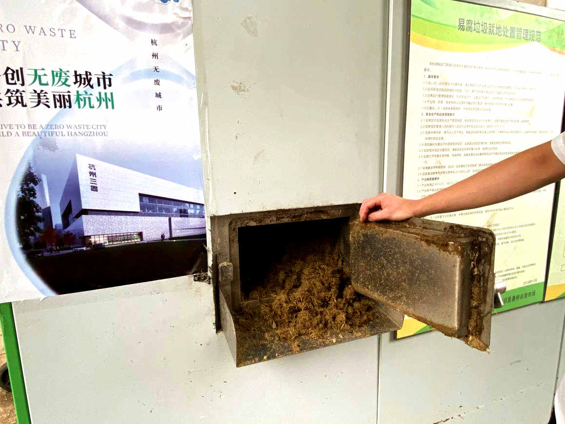 易腐垃圾微生物處理機每天能產出200公斤左右有機化肥。人民網 方彭依夢攝