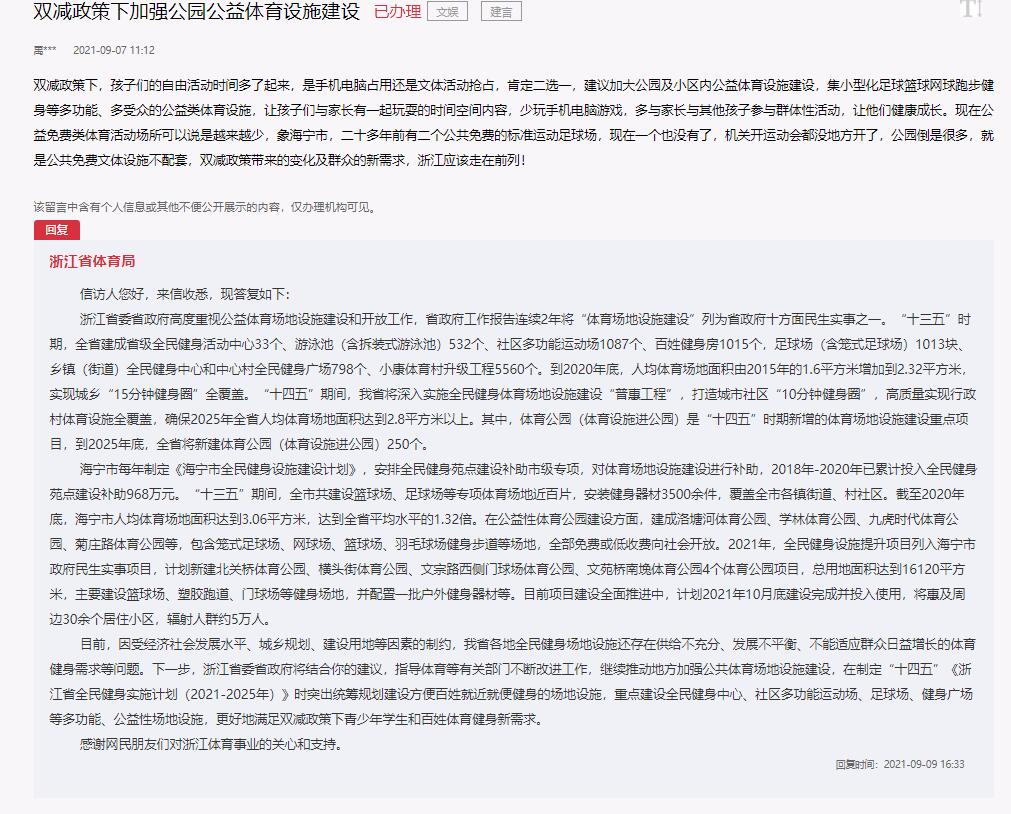 針對問題,浙江省體育局在9月9日對該網民的建言給與了回應: