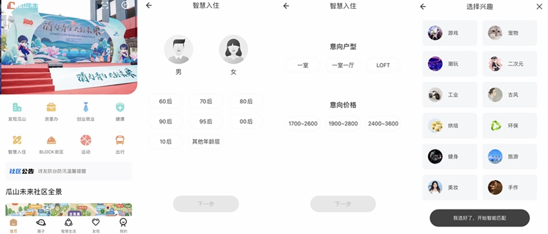 “‘瓜山未來社區’APP為我們這些新租客提供了找公寓的功能。點開APP里的‘智慧入住’,填寫自己的性別、年齡段、入住意向、興趣愛好等信息后,APP便自動為我推薦了幾間公寓。同時,每個公寓還配上了視頻,不用實地跑就能看到房子長什么樣!鞭k理入住時,盧波通過APP選擇了自己心儀的套間,并線上完成了簽約,整個過程只用了不到20分鐘。
