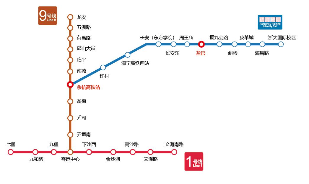 1號線-9號線-杭海城際換乘導向圖
