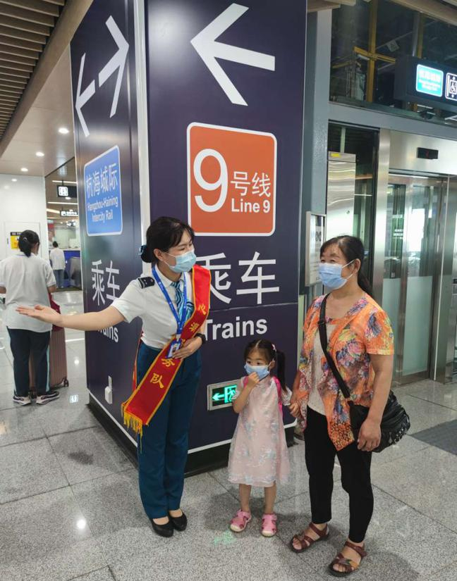 余杭高鐵站站務員引導乘客換乘杭海城際鐵路。浙江軌道集團海寧分公司供圖