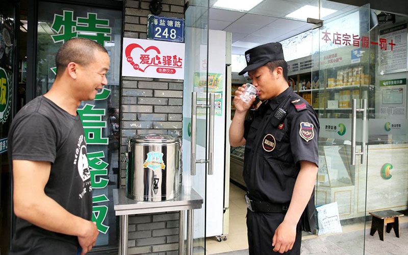 “我負責這附近的環衛工作,最近天氣特別熱,來這里喝口水、歇歇腳,太好了!”在“紅色驛站”休息的黃大爺說。