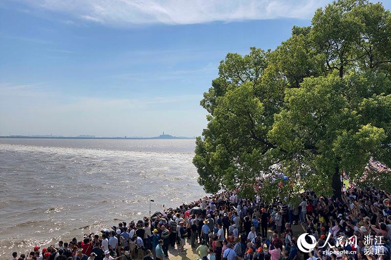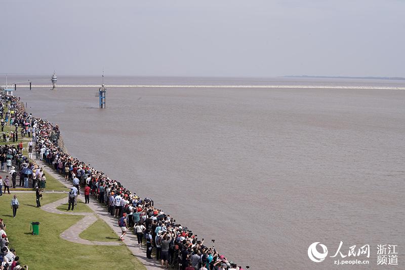 遠處的江面上出現一條白線,是正在全速趕來的一線潮。人民網 秦文攝