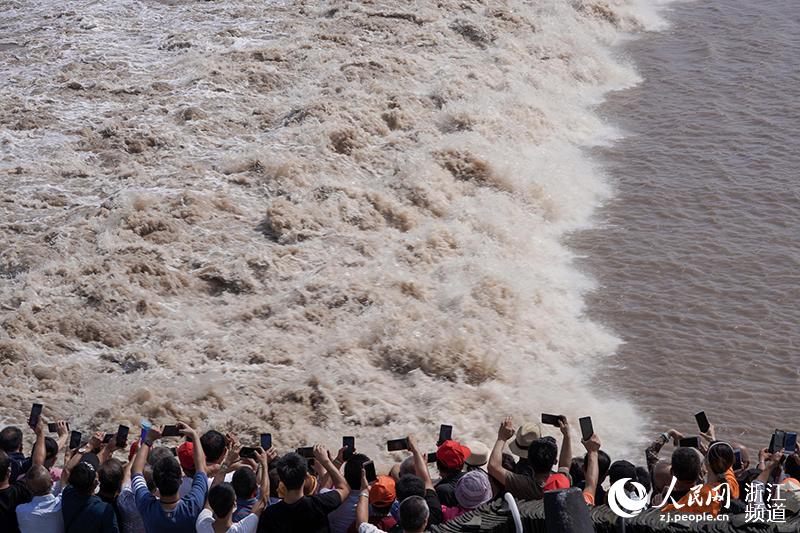 近觀潮頭,水浪翻滾奔涌,氣勢磅礴。人民網 秦文攝