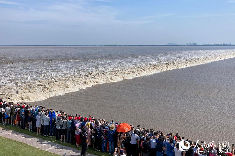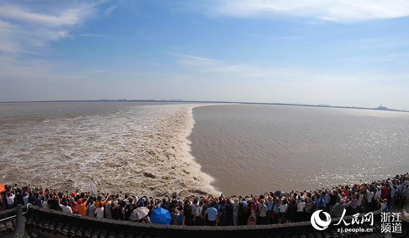 奔襲而來,大潮右側仍然較直,左側逐漸彎曲。人民網 秦文攝