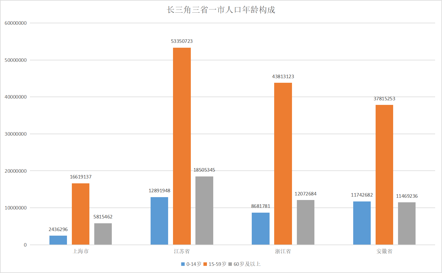 15-59歲人口占比,上海、江蘇省、浙江省、安徽省均超過60%。其中,上海市常住人口中,15-59歲人口為16619137人,占66.8%;江蘇省常住人口中,15-59歲人口為53350723人,占62.95%;浙江省常住人口中,15-59歲人口為43813123人,占67.86%;安徽省常住人口中,15-59歲人口為37815253人,占61.96%。