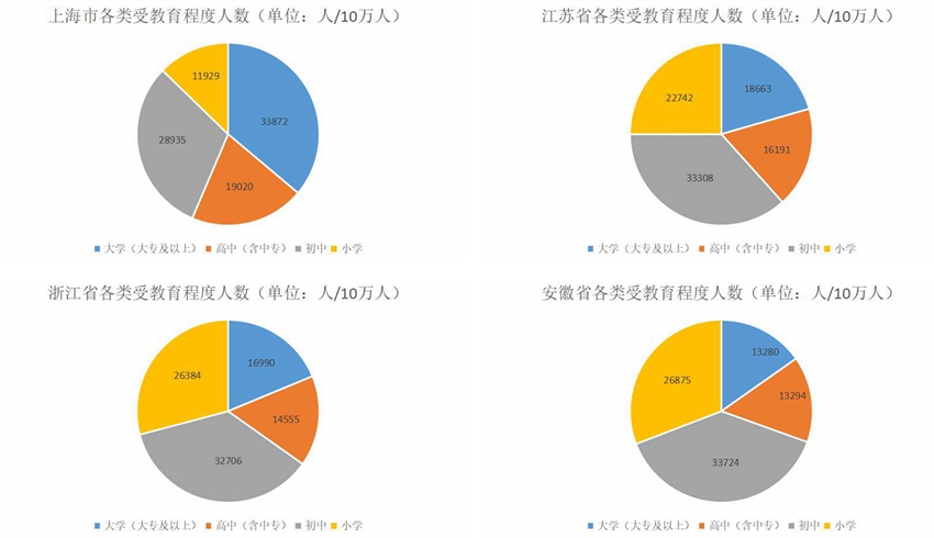 從各類受教育程度人數上看,每10萬人中,上海市擁有大學(指大專及以上)文化程度的人最多,33872人;江蘇省擁有大學(指大專及以上)文化程度18663人;浙江省擁有大學(指大專及以上)文化程度16990人;安徽擁有大學(指大專及以上)文化程度13280人。