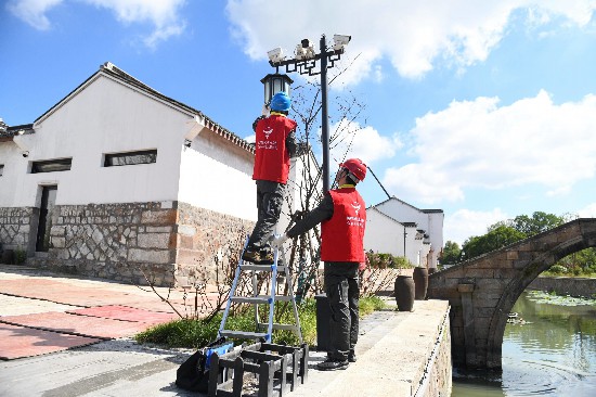 “門口牌匾的燈線還是要再做一下絕緣處理,以防陰雨天氣出現漏電情況!10月1日,在湖州八里店鎮潞村,國網湖州供電公司吳興分公司中共黨員服務隊員潘明宗、潘金庭正在對景區內供用電設備進行全方位檢查。