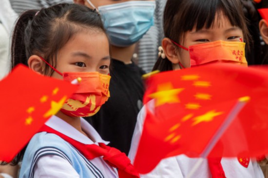 現場群眾有的戴著“中國紅”口罩,有的手持小國旗,還有的在臉上印著國旗的圖案,他們在觀旗區站定,用手機拍攝國旗教育館上方的巨幅五星紅旗,靜靜等待升旗儀式。