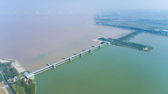 從空中俯瞰,中國第一河口大閘、浙東引水工程的樞紐工程——曹娥江大閘,宛如一條巨龍橫臥江口。