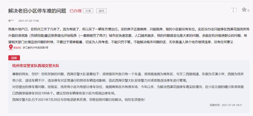 對此,杭州市交警支隊西湖交警大隊在回復中表示:今年以來,為解決西溪花園停車難實際情況,交警部門在小區北側的晴川街凌波路口西側漆畫停車泊位100余個。