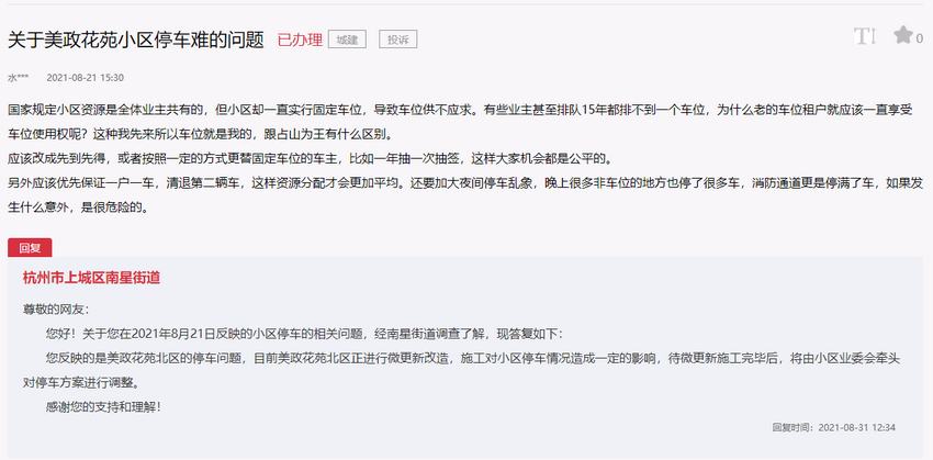 對此,杭州市上城區南星街道回復:目前美政花苑北區正進行微更新改造,施工對小區停車情況造成一定的影響,待微更新施工完畢后,將由小區業委會牽頭對停車方案進行調整。
