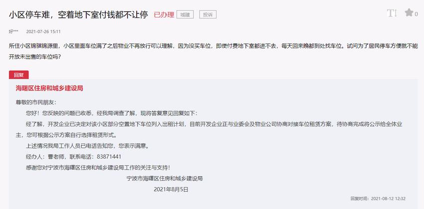 對此,寧波海曙區住房和城鄉建設局在回復中表示,經了解,開發企業已決定將該小區部分空置地下車位列入出租計劃,目前開發企業正與業委會及物業公司協商對接車位租賃方案,待協商完成將公示給全體業主。