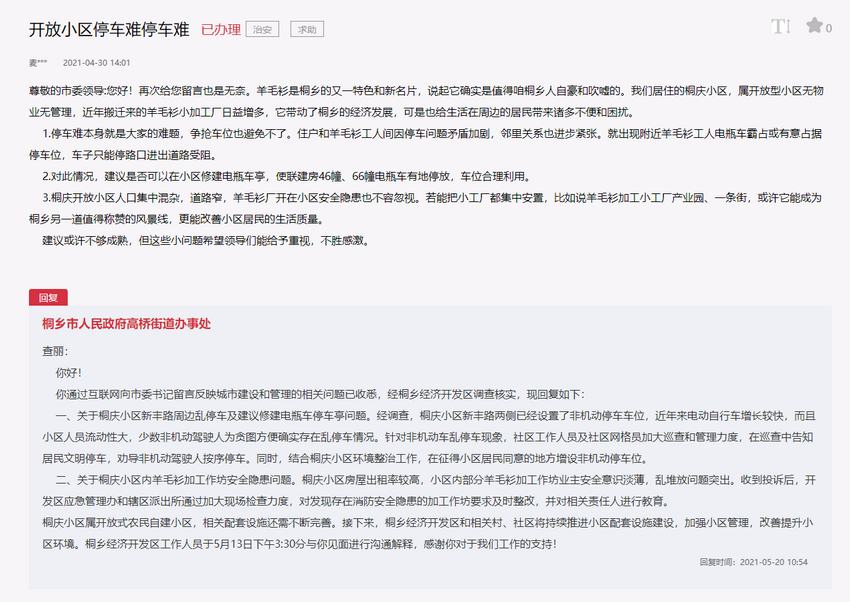 對此,桐鄉市人民政府高橋街道辦事處在回復中表示:經調查,桐慶小區新豐路兩側已經設置了非機動停車車位,近年來電動自行車增長較快,而且小區人員流動性大,少數非機動駕駛人為貪圖方便確實存在亂停車情況。針對非機動車亂停車現象,社區工作人員及社區網格員加大巡查和管理力度,在巡查中告知居民文明停車,勸導非機動駕駛人按序停車。同時,結合桐慶小區環境整治工作,在征得小區居民同意的地方增設非機動停車位。