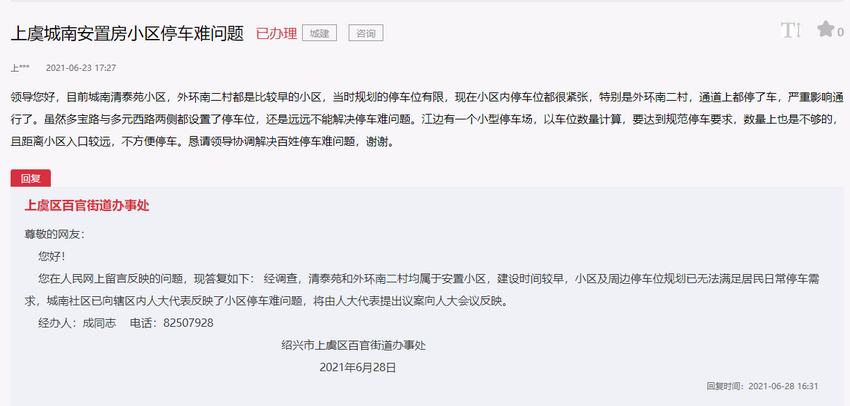 對此,上虞區百官街道辦事處在回復中表示:經調查,清泰苑和外環南二村均屬于安置小區,建設時間較早,小區及周邊停車位規劃已無法滿足居民日常停車需求,城南社區已向轄區內人大代表反映了小區停車難問題,將由人大代表提出議案向人大會議反映。
