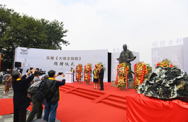 開幕式上,袁嘉騏美術館向余姚捐贈了大型玉雕《大儒王陽明》。該玉雕由重達1.37噸的獨山玉料雕刻而成,描繪的是王陽明游歷四明山賞月、寄情山水間的場景。這座玉雕將被放置于余姚王陽明故居內,供市民游客參觀品鑒。