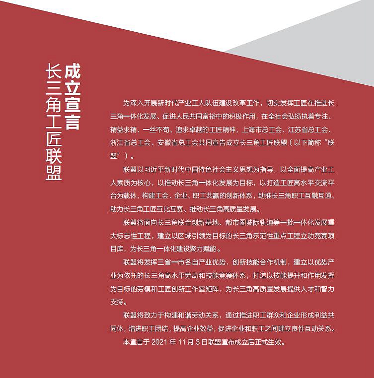 今天,三省一市總工會再次“牽手”,共同制訂發布了《長三角工匠聯盟共同行動計劃(2021-2025年)》。在弘揚工匠精神、團結廣大職工建功立業中,發揮長三角工匠聯盟的思想引領作用;在推進長三角一體化高質量發展中,發揮長三角工匠聯盟的聚力賦能作用;在加快建設知識型、技能型、創新型勞動者大軍中,發揮長三角工匠聯盟的品牌示范作用……五年行動計劃要求,大力弘揚執著專注、精益求精、一絲不茍、追求卓越的工匠精神,發揮工匠在企業技術進步、產業轉型升級和區域協同創新發展中的示范引領和骨干帶頭作用,激勵廣大職工在長三角區域一體化更高質量發展中建功立業。