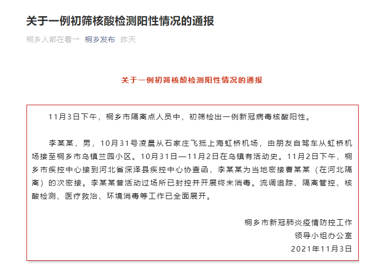 10月31日至11月2日在烏鎮有活動史。11月2日下午,桐鄉市疾控中心接到河北省深澤縣疾控中心協查函,李某某為當地密接曹某某(在河北隔離)的次密接。
