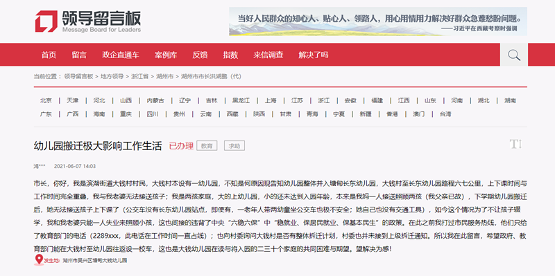 湖州吳興區濱湖街道大錢村村民鴻先生家是個二孩家庭,老大在上幼兒園,老小還沒達到入園年齡。因為夫妻倆工作繁忙,兩個孩子主要都是鴻先生的母親在帶。但隨著大錢村幼兒園整體并入離家六七公里外的塘甸長東幼兒園后,鴻先生一家為接送孩子的事情犯了難。因為新幼兒園門口沒有公交站點,且鴻先生的母親也不會騎車,所以接送孩子的任務只能落到夫妻倆身上。但夫妻倆又有工作在身,實在不方便接送孩子上學。于是,鴻先生在人民網“領導留言板”上求助:“希望政府、教育部門能在大錢村至幼兒園往返設一校車,這也是大錢幼兒園在讀與將入園的二三十個家庭的共同困難與期望。望解決為感!”