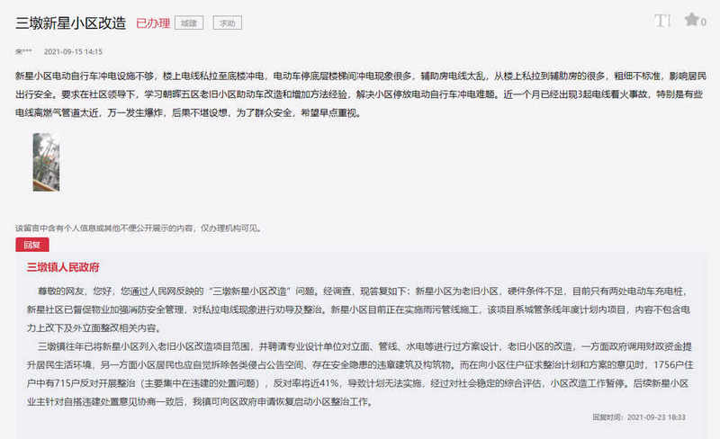 對此,浙江省杭州市西湖區三墩鎮人民政府在回復中表示,新星社區已督促物業加強消防安全管理,對私拉電線現象進行勸導及整治。同時,三墩鎮往年已將新星小區列入老舊小區改造項目范圍,但在向小區住戶征求整治計劃和方案的意見時,反對率將近41%,導致計劃無法實施,小區改造工作暫停。小區居民應自覺拆除各類侵占公共空間、存在安全隱患的違章建筑及構筑物。對自搭違建處置意見協商一致后,可申請恢復啟動小區整治工作。
