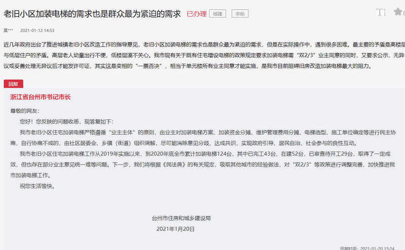 對此,浙江省臺州市住房和城鄉建設局回復:臺州市老舊小區住宅加裝電梯嚴格遵循“業主主體”的原則,由業主對加裝電梯方案、加裝資金分攤、維護管理費用分攤、電梯選型、施工單位確定等進行民主協商,自行協商不成的,由社區居委會、鄉鎮(街道)組織調解,盡可能消除意見分歧、達成共識,實現政府引導、居民自治、社會參與的良性互動。同時,針對部分業主意見難統一等問題,下一步,臺州市將根據《民法典》有關規定,吸取其他城市的經驗做法,對“雙2/3”等政策進行調整完善,加快推進加裝電梯工作。