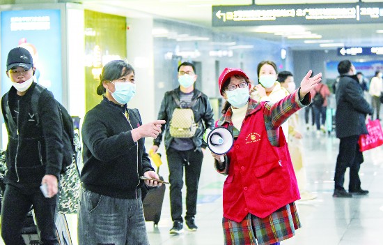 “請大家戴好口罩,保持間距排隊,出示健康碼!泵刻肆熊嚨竭_鐵路金華站的時候,志愿者梅蕊芳都手持小喇叭,在出站口循環播放防疫小貼士,引導旅客分散離開,避免人群聚集。梅蕊芳說,疫情防控人人有責,出行時更要做好防護措施,健康安全乘車。(李建林)