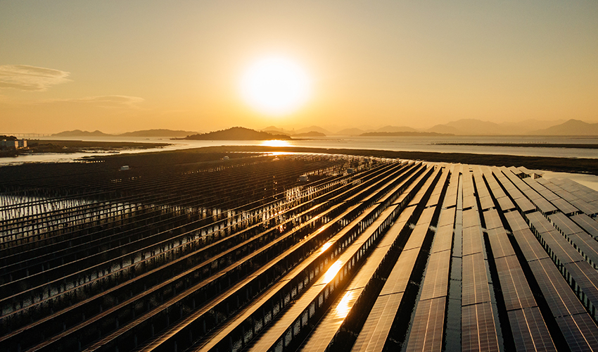 落日余暉中的玉環華能清港灘涂漁光互補光伏電站。陳維益攝