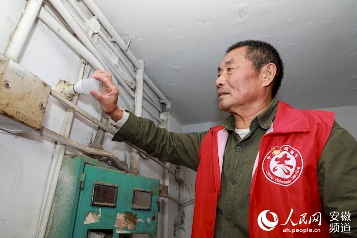“培紅志愿服務隊”志愿者在更換小區居民樓道照明燈。人民網 張俊攝