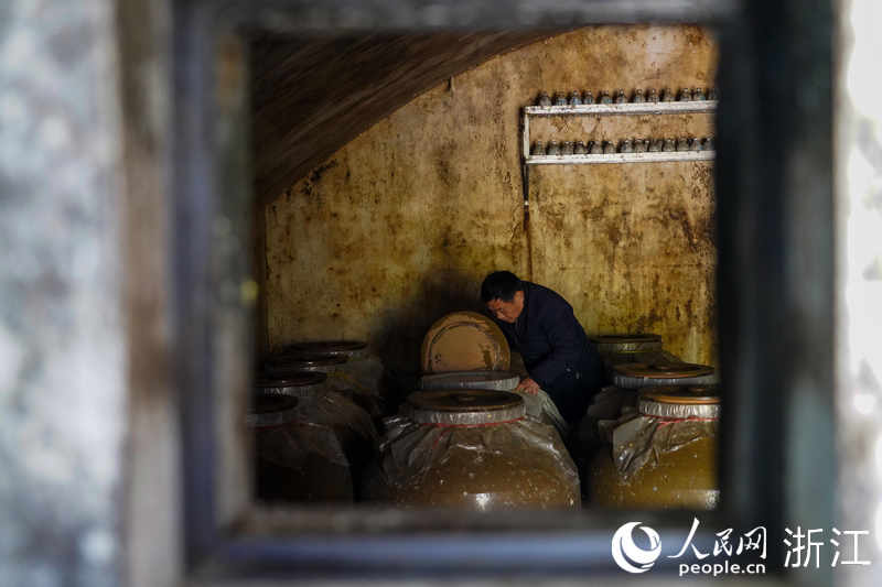 11月16日,村民吳順祥在酒窖檢查桂花酒的釀造情況。人民網 章勇濤攝