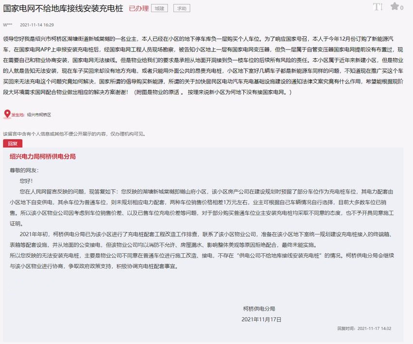 對此,紹興電力局柯橋供電分局在回復中表示,無法安裝充電樁主要原因在于物業公司不同意在普通車位進行施工改造、接電,柯橋供電分局會繼續與該小區物業進行協商,爭取政府政策支持,積極協調充電樁配套事宜。