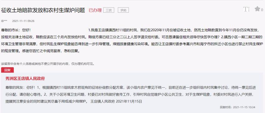 對此,秀洲區王店鎮人民政府在回復中表示,對于生煤爐現象,村委會對村民進行入戶關照,提醒其注意安全的同時,還建議其盡量不用或減少用煤爐。