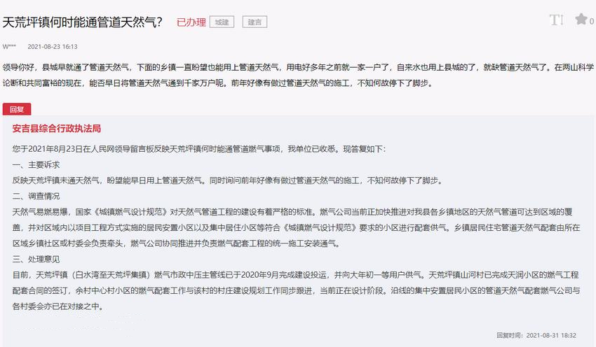 一位網友在人民網“領導留言板”反映,安吉縣城早就通了管道天然氣,而下面的鄉鎮大多數家庭卻一直在用煤氣罐,既不安全也不環保,詢問天荒坪鎮何時能通管道燃氣。