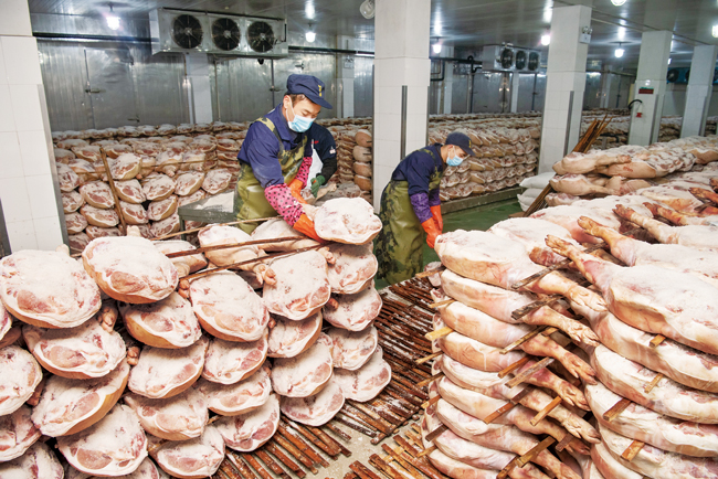 近日,位于金華市金義新區澧浦鎮一火腿企業的車間里,技師忙著給豬后腿上鹽,用傳統工藝加工金華火腿。69歲的火腿加工技師沈桂相說,第一道工序叫“上大鹽”,把中粗海鹽撒在豬后腿上,像下雪一樣均勻鋪在肉面上,動作看似簡單,但手法手勢很有講究,需要師傅多年的經驗積累。第三天再撒第二道鹽。據介紹,傳統的金華火腿生產加工季節從農歷立冬后到次年立春前,這段時間溫度穩定,適合生產加工。(時寬兵)