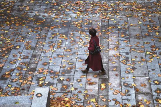 11月22日是二十四節氣的“小雪”,一大早,在嘉興市區,樹葉被大風吹落一地,出行的市民也穿上了棉衣。(王振宇)