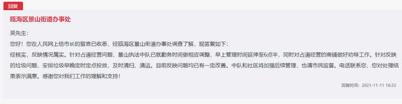 回復中提到,針對占道經營問題,景山執法中隊已就勤務時間進行了相應調整,早上管理時間延伸至6點半,同時對占道經營的商鋪做好勸導工作。針對網友反映的垃圾問題,也已安排垃圾早晚定時、定點投放,及時清掃、清運。