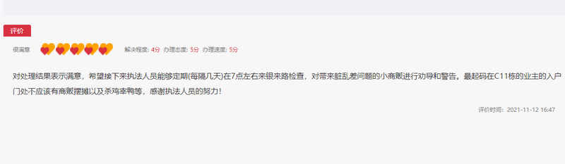 對于處理方式和結果,吳先生表示滿意,并在“領導留言板”上打出五星好評:希望接下來,執法人員能夠定期(每隔幾天)在7點左右來銀來路檢查,對造成臟亂差問題的小商販進行勸導和警告,同時感謝執法人員的努力。