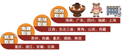 從地區差異來看,海南、廣東、四川等南部省份“吃肉取暖”消費高;江西、東北三省、青海、西藏地區“毛絨取暖”消費高于全國;西南地區貴州、西藏、重慶電器取暖消費高,重慶、浙江、安徽、云南等地更偏好“精準取暖”。